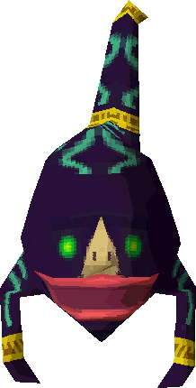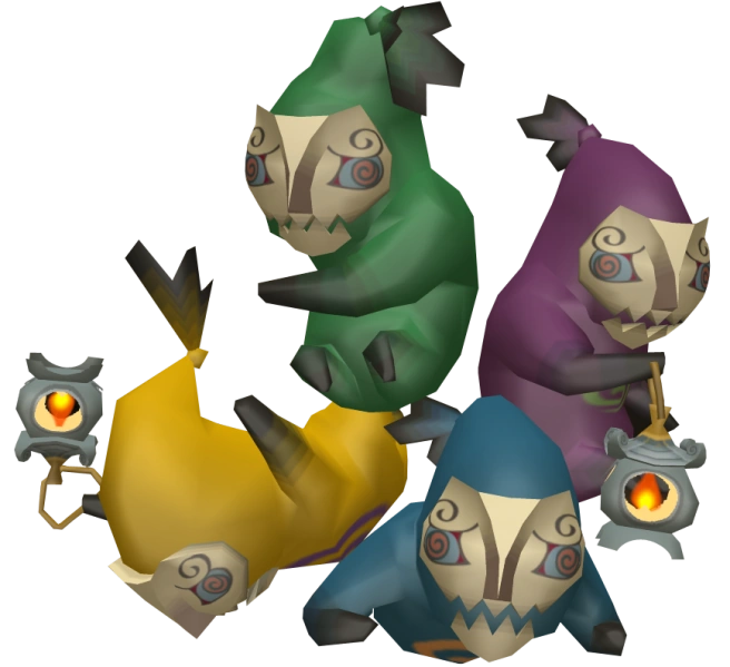 Poes have faces that resemble skull-like masks and their bodies seem to be comprised of brightly colored pajama-like garments. Poes must be exposed to Sunlight to be made tangible. After this has been done, they can be killed with most weapons. In order to do this, Link must first obtain the Mirror Shield and then use it to reflect Sunlight upon them, or use Medli's Harp for the same purpose. Poes can also possess Link, reversing the controls of the game for a short while. If Link is possessed, he does not take damage, but it becomes more difficult for him to avoid hazards and enemy attacks. When possessing Link, their distinctive masks chatter and laugh above his head; Link can instantly remove the possession by entering sunlight, but the Poe that possessed him will disappear after the effects wear off regardless. It also goes away if Link gets hit by an enemy. Poes mostly appear in the Earth Temple, and are ruled by Jalhalla, the boss of said temple, who is composed of fifteen Poes.